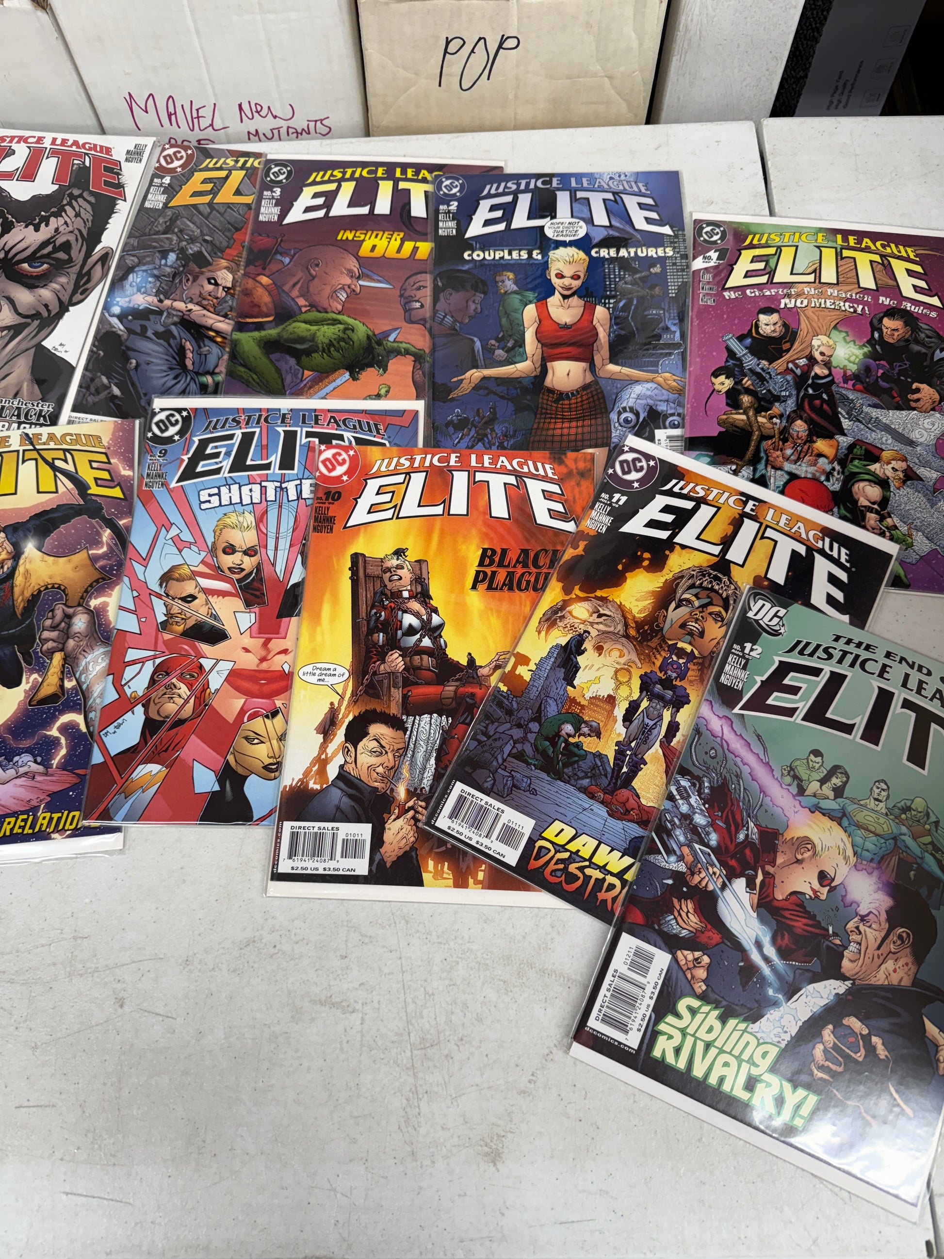 The product is a complete series run of the JUSTICE LEAGUE ELITE comic books from 2004 by DC Comics. With artwork by Doug Mahnke and writing by Joe Kelly, this set features characters like Green Arrow and Flash within the DC Universe. Each issue is graded at 9.4 Near Mint and comes boarded and bagged for preservation. Perfect for collectors interested in modern age comics and the Justice League of America superhero team, this set captures the essence of the superhero genre within the US Comics tradition. Box 4 |